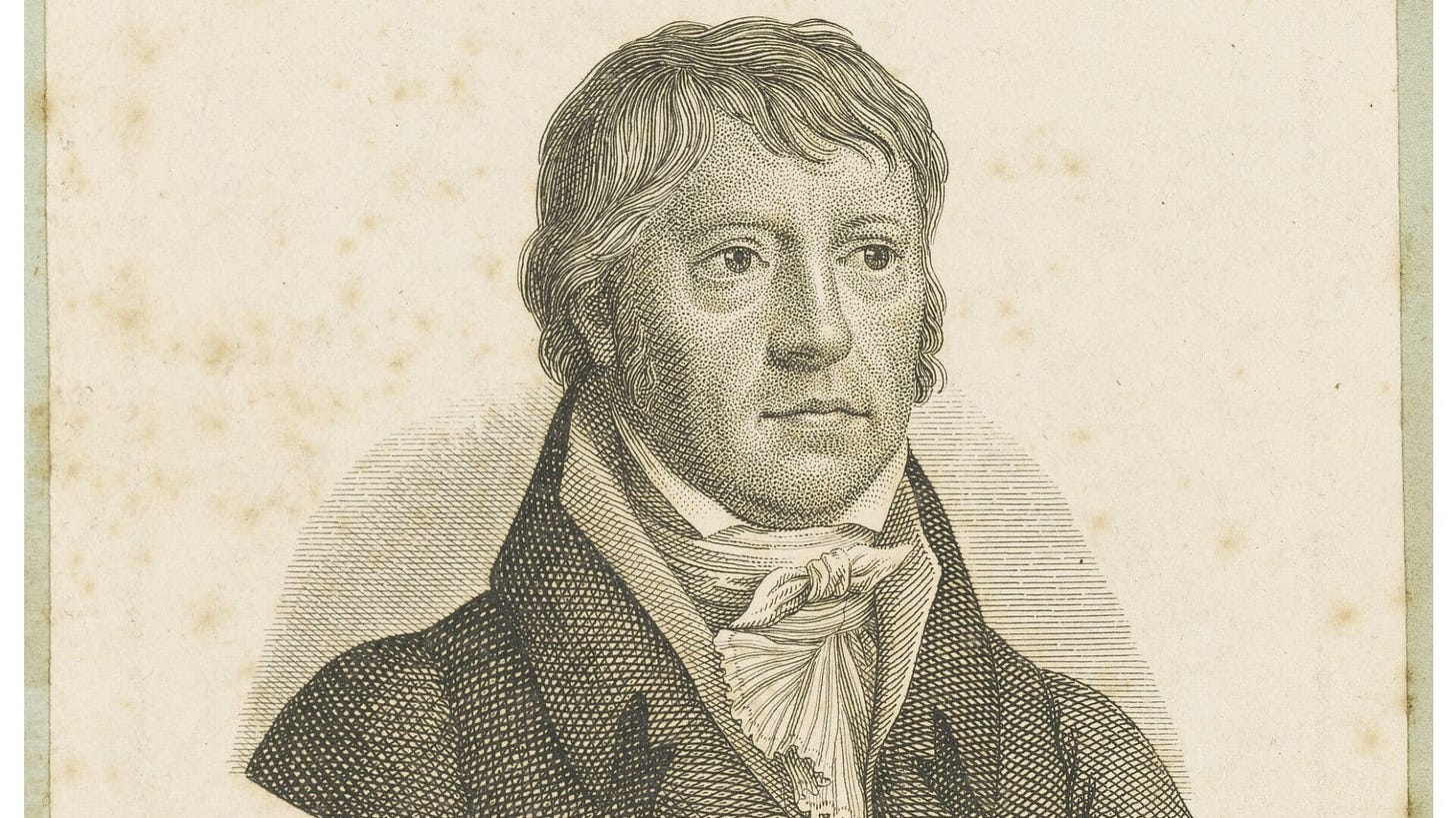 Georg Wilhelm Friedrich Hegel, born in Stuttgart in 1770, was significantly shaped by the intellectual environment of his time. He studied philosophy and theology at the University of Tübingen between 1788 and 1793, where he developed enduring friendships with future luminaries such as Friedrich Hölderlin and Friedrich von Schelling. These relationships were pivotal in the evolution of Hegel's ideas, intertwining their philosophical explorations and setting the stage for his later works, which became key figures in the Romantic movement and German philosophical thought in the early nineteenth century.